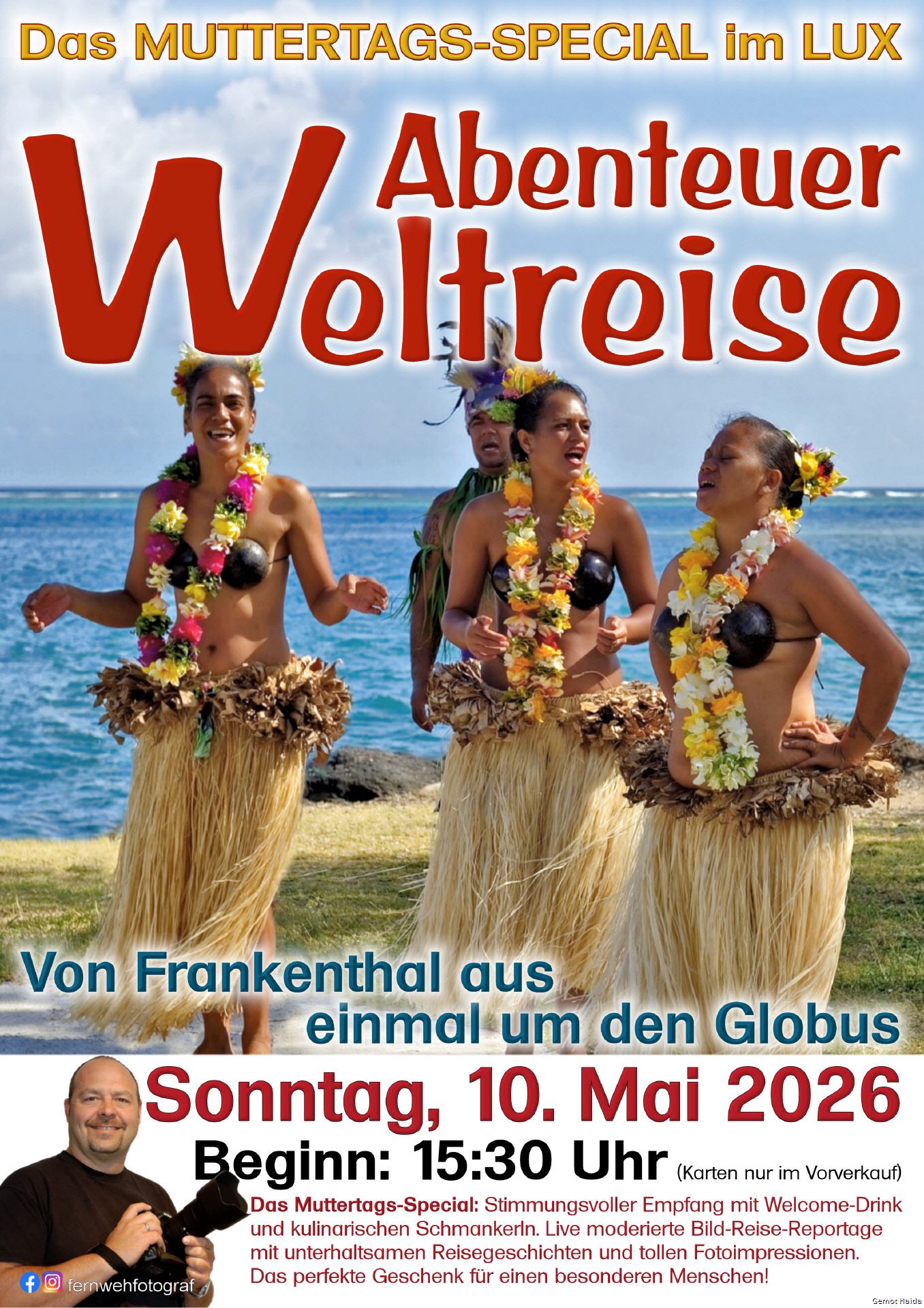 Diese Bild-Reise-Doku nimmt Sie mit zu echten Sehnsuchtsorten! Rio de Janeiro, Kap Hoorn, Rapa Nui (Osterinsel), Australien, Neuseeland, Südsee und viele weitere Destinationen werden in dieser sehens- und hörenswerten Multivision in beeindruckenden Bildern und Videos gezeigt. Atemberaubende Landschaften, hautnahe Tierbegegnungen, Menschen und Städte, fremde Kulturen - eine Produktion, die man sich nicht entgehen lassen sollte. Natürlich live, natürlich in bester Bild- und Tonqualität.