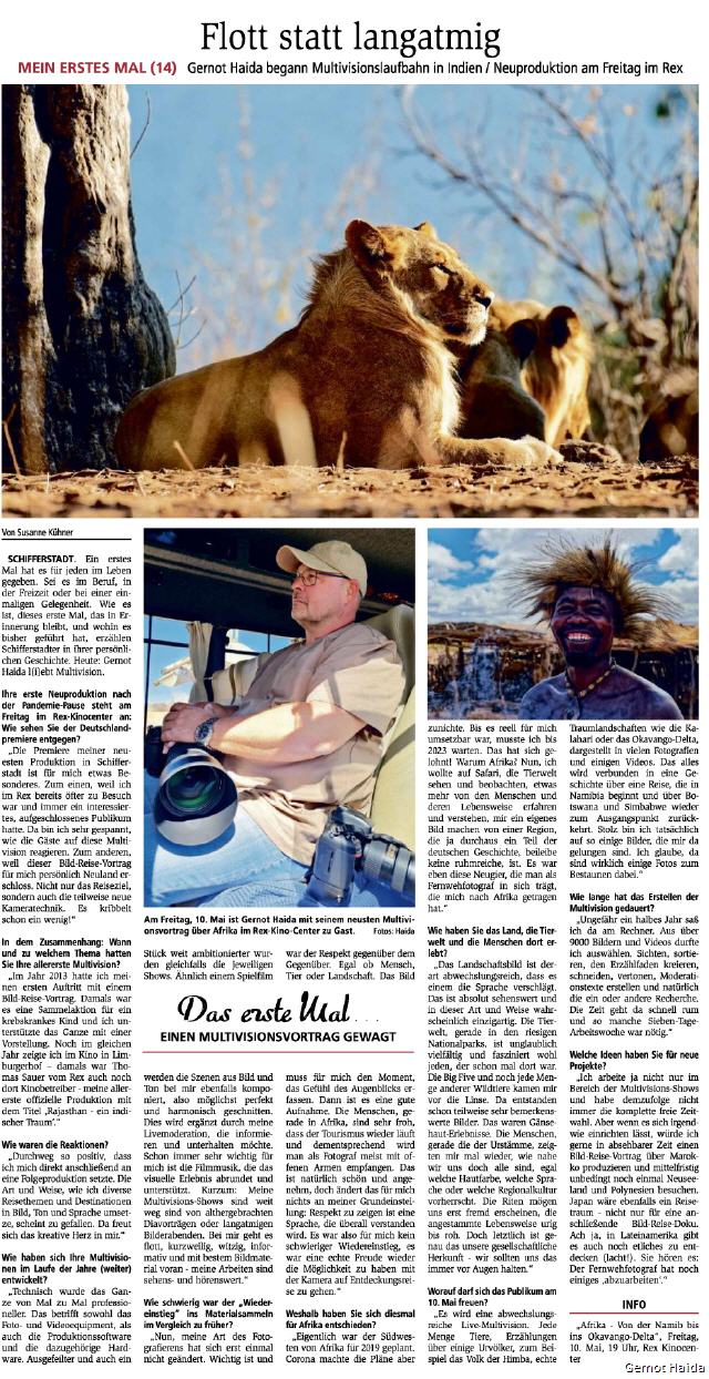 Frau Susanne Kühner führte das Interview zur Deutschlandpremiere der Multivision AFRIKA - von der Namib bis ins Okavango-Delta, die am 10. Mai 2024 im Rex-Kino-Center stattfindet, mit mir. Der Artikel erschien am 6.5.24 im Schifferstadter Tagblatt. Hier geht´s zum Artikel [1.247 KB]